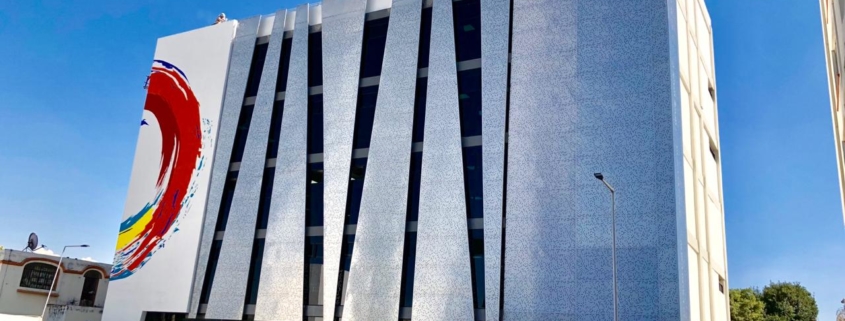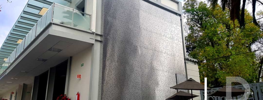 Fabricado en lámina de acero inoxdable; Este proyecto fue instalado sobre una fachada de durock y concreto, usando bastidores 2X2″ y 2×1″ y fijados con pija de acero inoxdable.