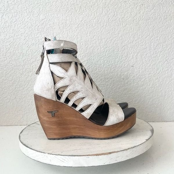 Condition: These are new wedges. There is a part of the wood missing on the right inside shoe - please see close up pics. They are still in working order. They fit true to size and will come with a box. These are genuine leather. They have a zip closure, and the ankle straps have elastic for comfort.